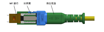 1)MT插芯最大程度地伸出MOC连接器,对接完成时被压缩回最终位置,因此MT插芯初始弹簧对接力很小,光纤端面不容易撞花。